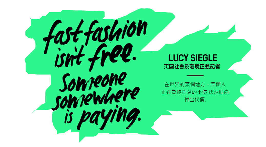 Lucy Siegle 是英國社會及環境正義方面議題首屈一指的記者,2015年她出版了一本書: 為什麼你該花更多的錢,買更少的衣服?拯救地球,也拯救你衣櫃的新購衣哲學 內容道盡了血汗工廠的一切,書上寫到: “我們正生活在一個「衣」滿為患的時代。"、"僅以英國為例,每年完全都沒被穿過的衣服竟多達24億件…。真正難以彌補的是,我們為了生產廉價的快速時尚付出的社會成本。為了利潤極大化,大量的血汗工廠――沒有基本工資保障、超時加班、童工、強迫勞役、虐待、性侵害――已為成衣產業不可告人但也不可或缺的一環。在有八成的婦女是成衣工人的孟加拉,因為工廠缺乏安全考量,火災與倒塌已經奪走上千條性命。快速時尚不談人權。"