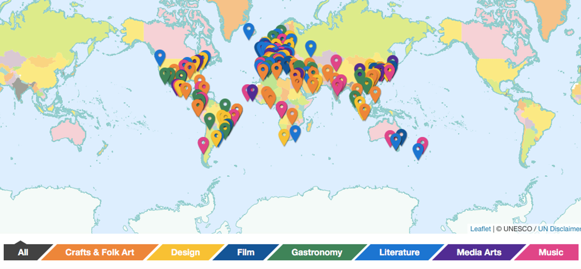 追尋創意的想像,到創意城市地圖,集結72個國家,7個創意領域:工藝、民間藝術、設計、電影、美食、文學、音樂和媒體藝術的推薦地標,以文化、設計、藝術進行跨界的交流 | https://en.unesco.org/creative-cities/home