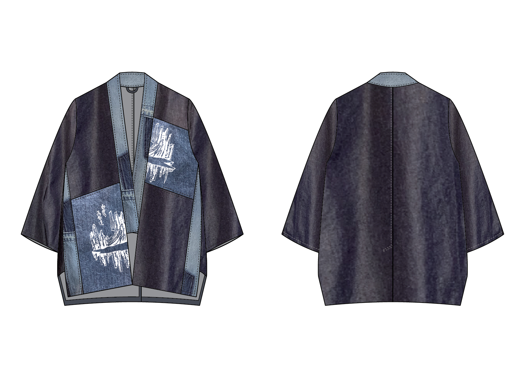 我們以博士的水墨搭配字帖設計印花,結合日式絲瓜領外套、日式立體剪裁外罩,在衣服上呈現山水的空間感。