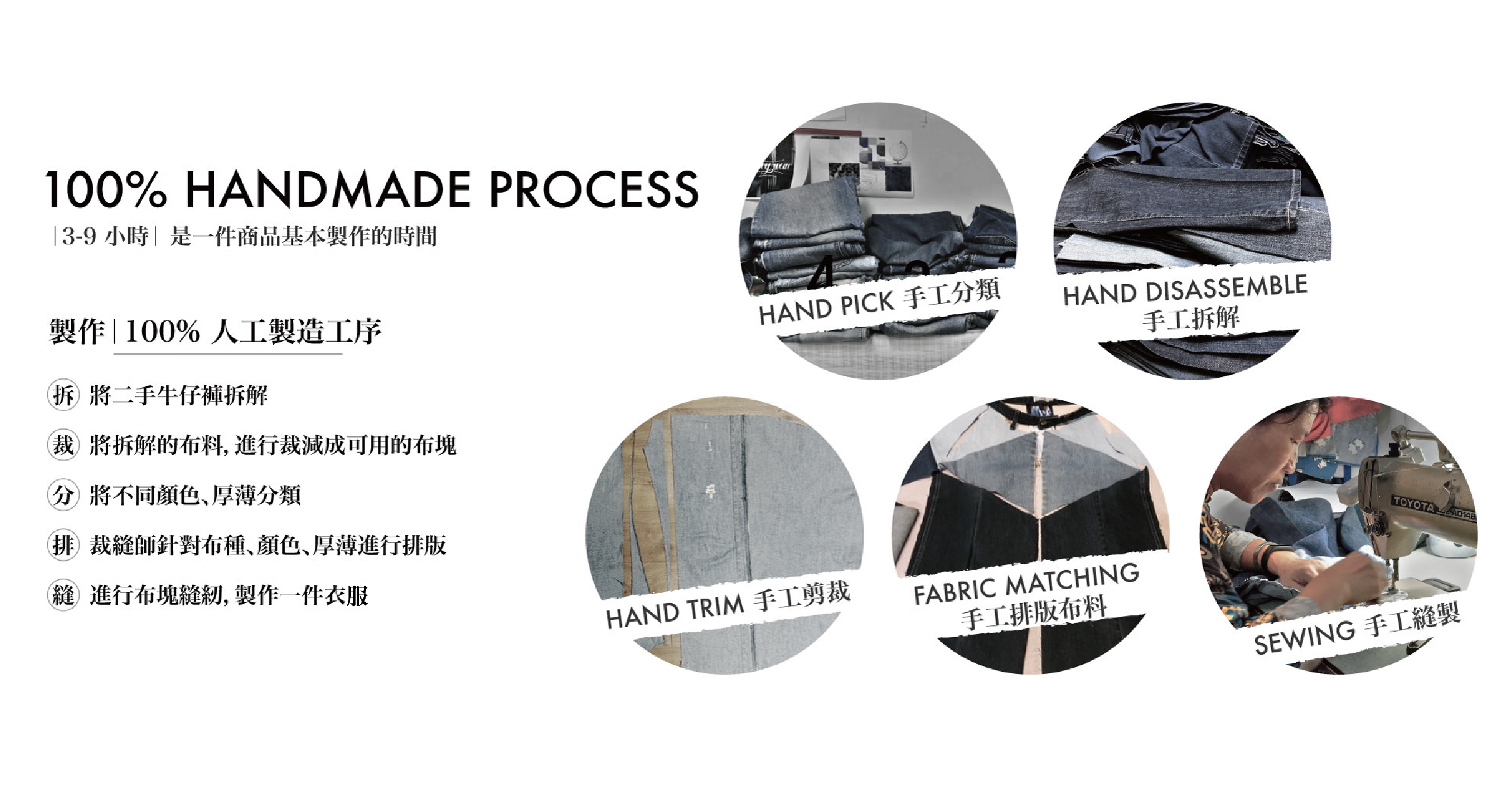 生產線由台灣在地裁縫師、二度就業婦女、腦麻家庭組成,從拆解到拼接100%手工製作。