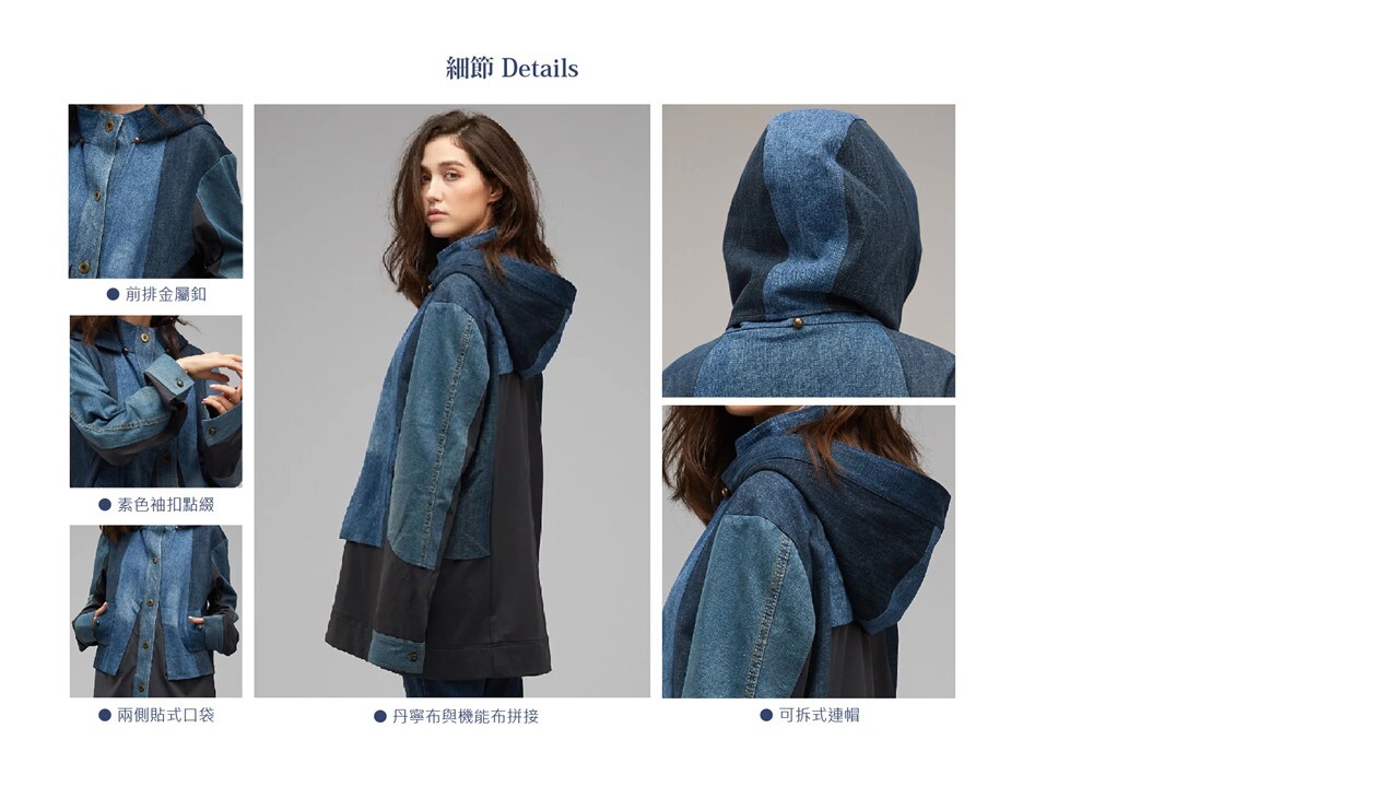 ▎厚度適中的工裝系風衣,丹寧拼接機能布,背後連帽可拆卸