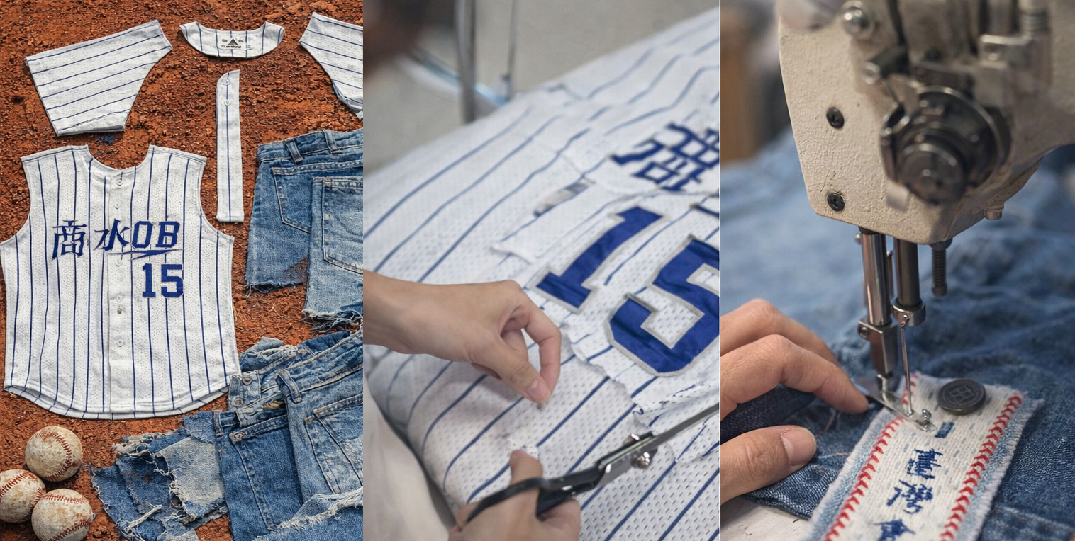Story Wear 將承載熱血的「退役球衣」與象徵堅韌的「回收丹寧」重新拼接,由在地裁縫師手工裁製、車縫完成。